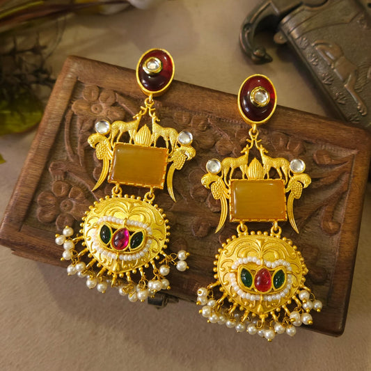 Elevate your style with these exquisite Gold plated earrings blending traditional artistry with modern elegance. Handcrafted from high-quality brass, these earrings feature intricate detailing . The brass base lends durability while maintaining a lightweight feel, making them perfect for pain free wear. These earrings are ideal for weddings, festive occasions, or a special evening out, making you stand out with their regal charm.