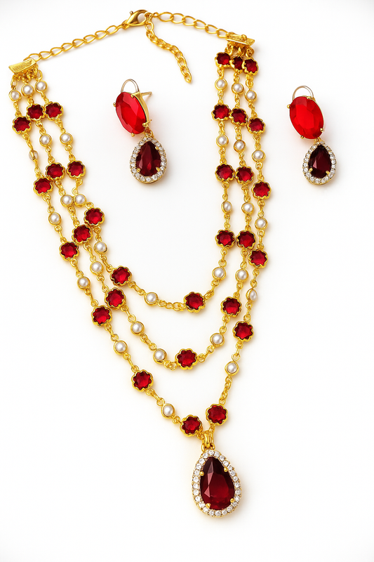 Gold-Plated Kundan & Ruby Chandbali Earrings with Pearl Drops