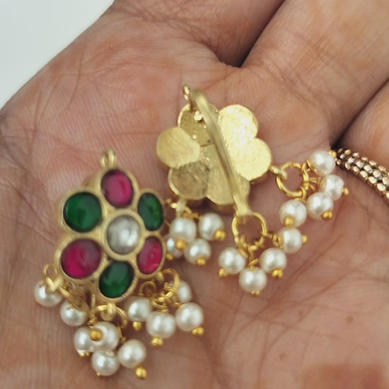 Add a touch of traditional elegance to your look with these exquisite Floral Bugadi Earrings. Crafted with precision, each earring features a radiant floral design adorned with red and green stones, centered by a sparkling kundan accent. The delicate pearl drops add a graceful charm, making them perfect for festive occasions, weddings, or ethnic celebrations.