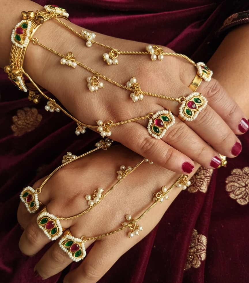 Lightweight yet striking, this haathphool is ideal for weddings, mehendi functions, festive celebrations, and photoshoots — making your hands look truly regal and camera-ready.