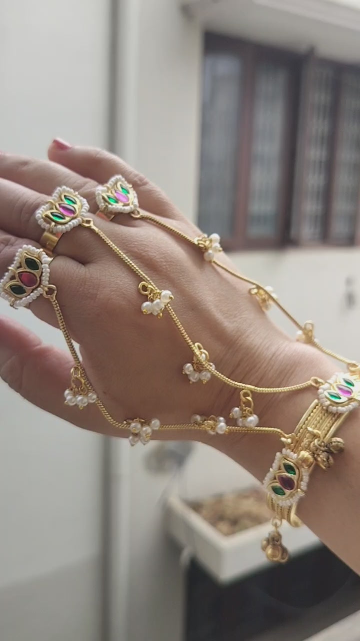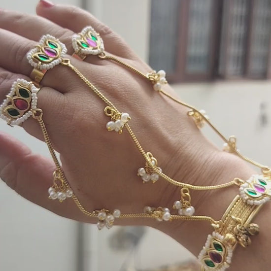 Elevate your ethnic look with this exquisitely crafted Haathphool, designed to add a touch of royalty to your hands. Featuring elegant crescent motifs adorned with delicate pearl clusters, this hand harness beautifully connects the bracelet to the rings with fine gold-tone chains, creating a graceful and feminine silhouette.