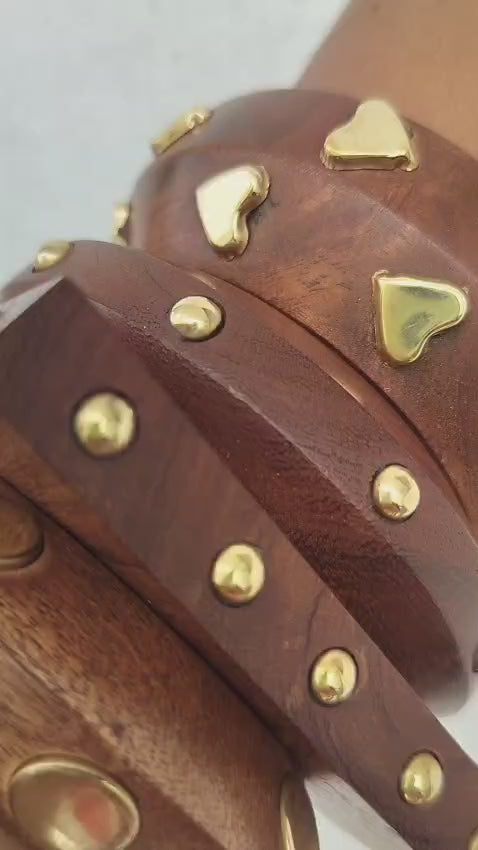Heartbeat Bangle – Rich wooden base with gold-toned heart studs