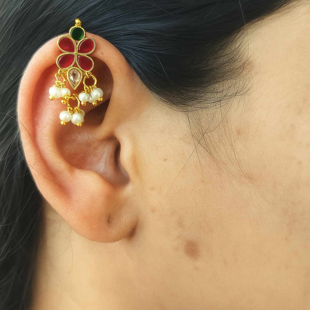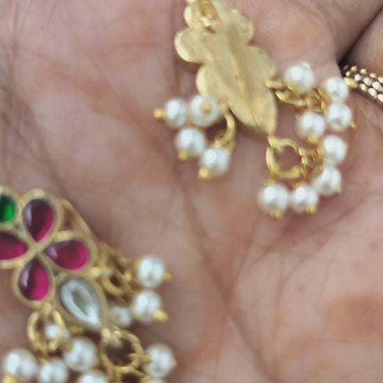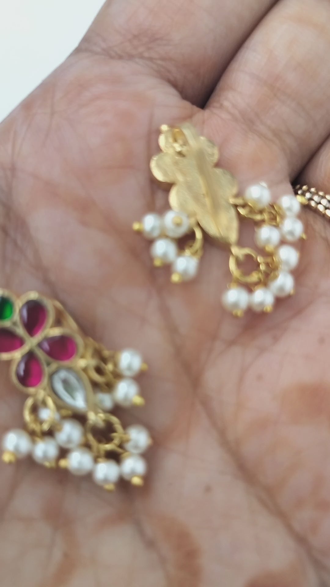 Add a touch of traditional elegance to your look with these exquisite press bugadi in pink. The delicate pearl drops add a graceful charm, making them perfect for festive occasions, weddings, or ethnic celebrations.